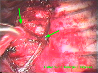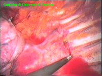 forze: 1 - il collasso polmonare che segue al pneumotorace; 2 - la trazione verso il basso esercitata dalla forza di gravità sul polmone parzialmente collassato; 3 - la compressione con il retrattore a ventaglio (fan retractor). La ventilazione è assicurata da una maggiore frequenza respiratoria (circa 20 atti al minuto) con un tidal volume leggermente ridotto. Di seguito descriviamo un intervento condotto con questa tecnica: |